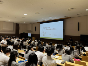 10月9日(木)、3年生対象の人権LHRにて、「よしむら助産所」助産師の吉村真弓さんに「つながるいのち~助産の現場から思うこと~」というテーマでご講演いただきました。